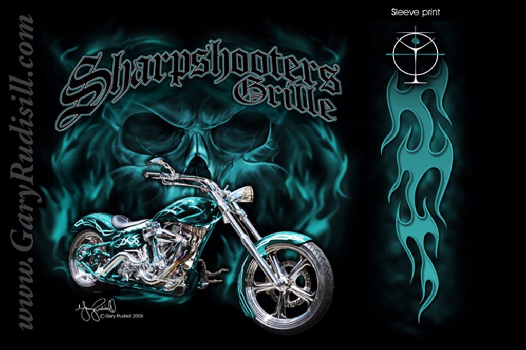 Commissioned T-Shirt Design | Adobe Illustrator & Photoshop This custom T-shirt design was commissioned by Sharpshooters Grille, a bar and grill in Gettysburg, PA, for their annual Bike Week event. Created using Adobe Illustrator and Adobe Photoshop, the artwork features a chrome-detailed custom chopper set against a smoky skull background, capturing the energy and attitude of the event. I developed the full design and sleeve art, completed the color separations, and managed in-house screen printing to ensure a bold and precise final product.